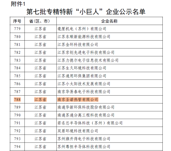 日前,江苏省工业和信息化厅正式发布新一批国家级专精特新“小巨人”企业名单,中圣科技集团旗下南京圣诺公司成功入选。此次获评不仅是集团发展历程中斩获的又一项国家级荣誉,更标志着南京圣诺公司在技术实力、行业地位和市场竞争力等方面获得国家权威机构的高度认可。